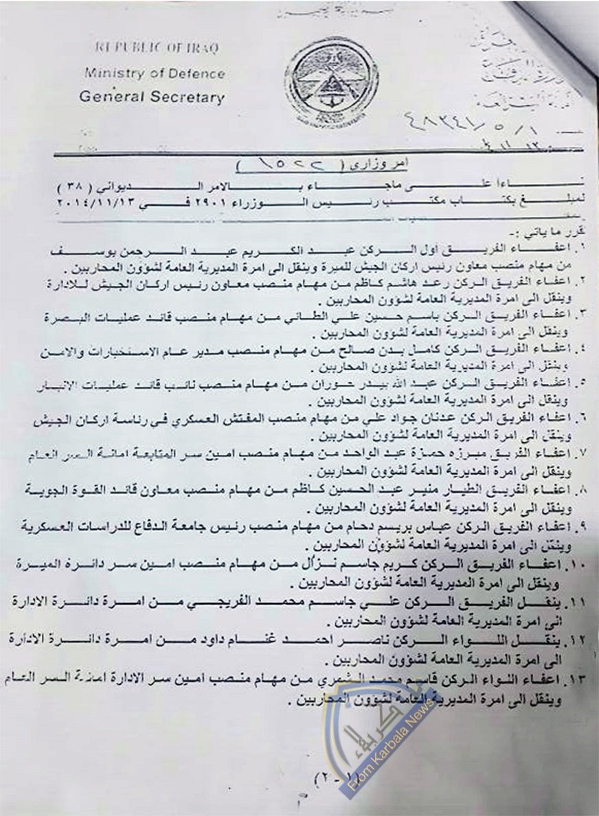 (من كربلاء الخبر) تنشر اسماء القادة المحالين الى شؤون المحاربين