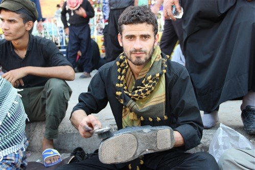 زائرين إيرانيين يتبرعان بصبغ وتنظيف أحذية زائري عاشوراء بكربلاء مجانا