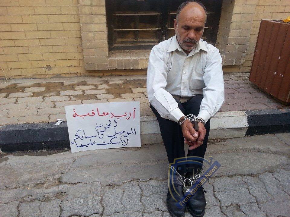 شخص يقيد يديه ورجليه في شارع المتنبي ويرفض مغادرته قبل معرفة مصير اخيه الذي فقد بقاعدة سبايكر
