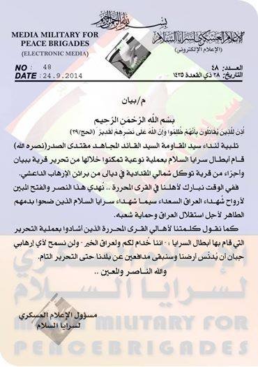 سرايا السلام تعلن تحرير قرية ببيان واجزاء من توكل شمالي المقدادية بديالى
