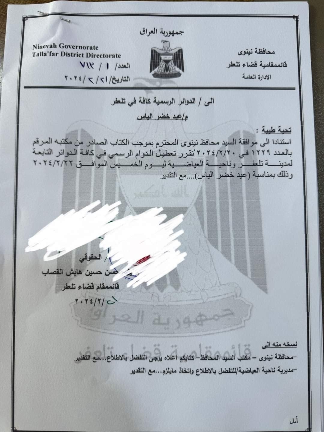 نينوى تعطّل الدوام الرسمي في تلعفر والعياضية