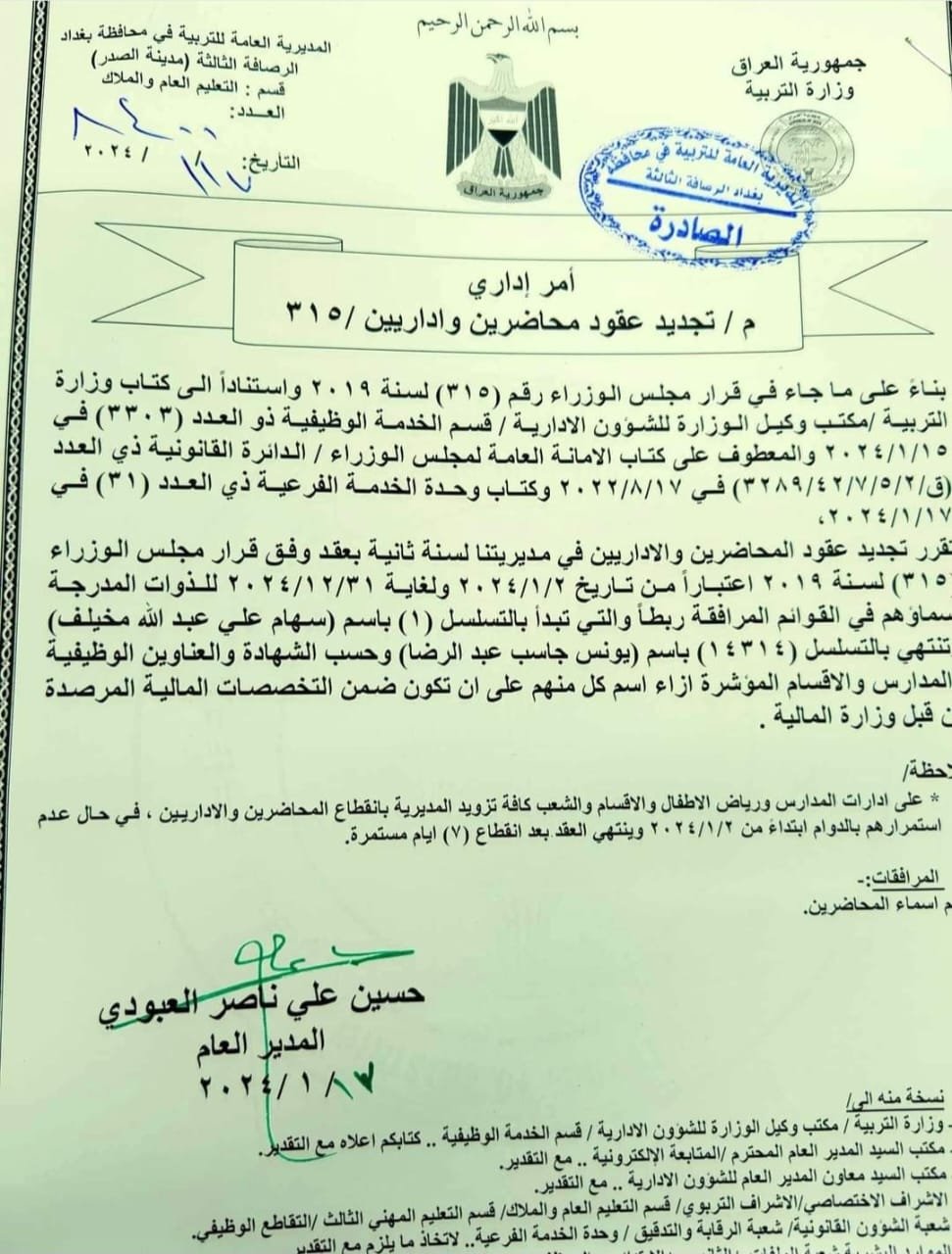 بالوثيقة.. تجديد عقود محاضرين واداريين في تربية الرصافة الثالثة