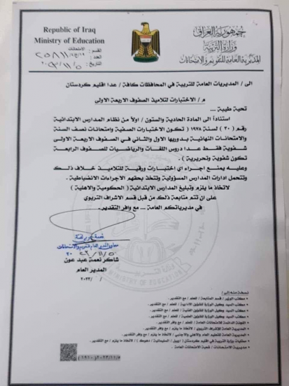 التربية تمنع الاختبارات الورقية لطلاب الاول وحتى الرابع الابتدائي