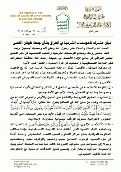 بيان مشترك "للمؤسسات الشرعية" في العراق يدعو لفتح "التطوع" لطوفان الأقصى