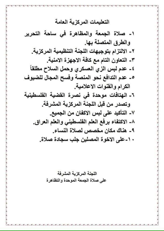 اللجنة المشرفة على تظاهرات الجمعة في التحرير تصدر 10 تعليمات
