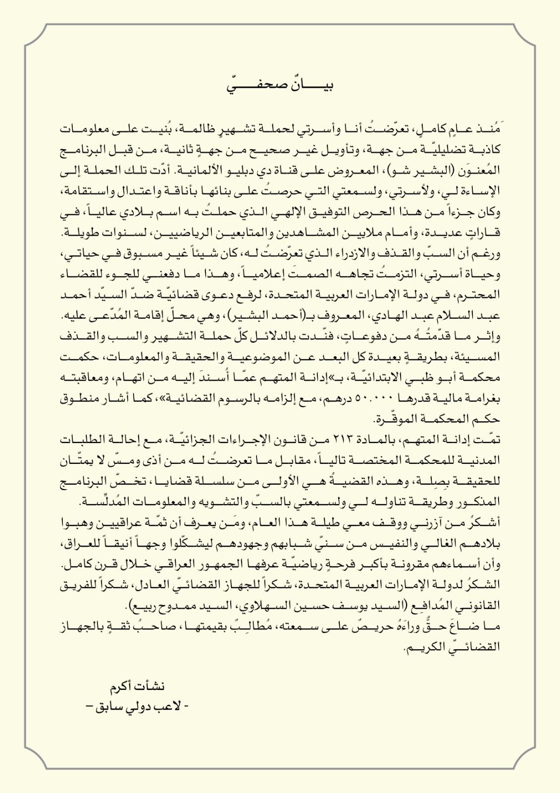نشأت أكرم يقول إنه كسب دعوى قضائية رفعها ضد "أحمد البشير" في الإمارات