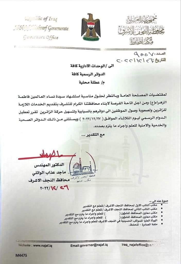 ? محافظة النجف الأشرف تقرر تعطيل الدوام الرسمي يوم غد الثلاثاء