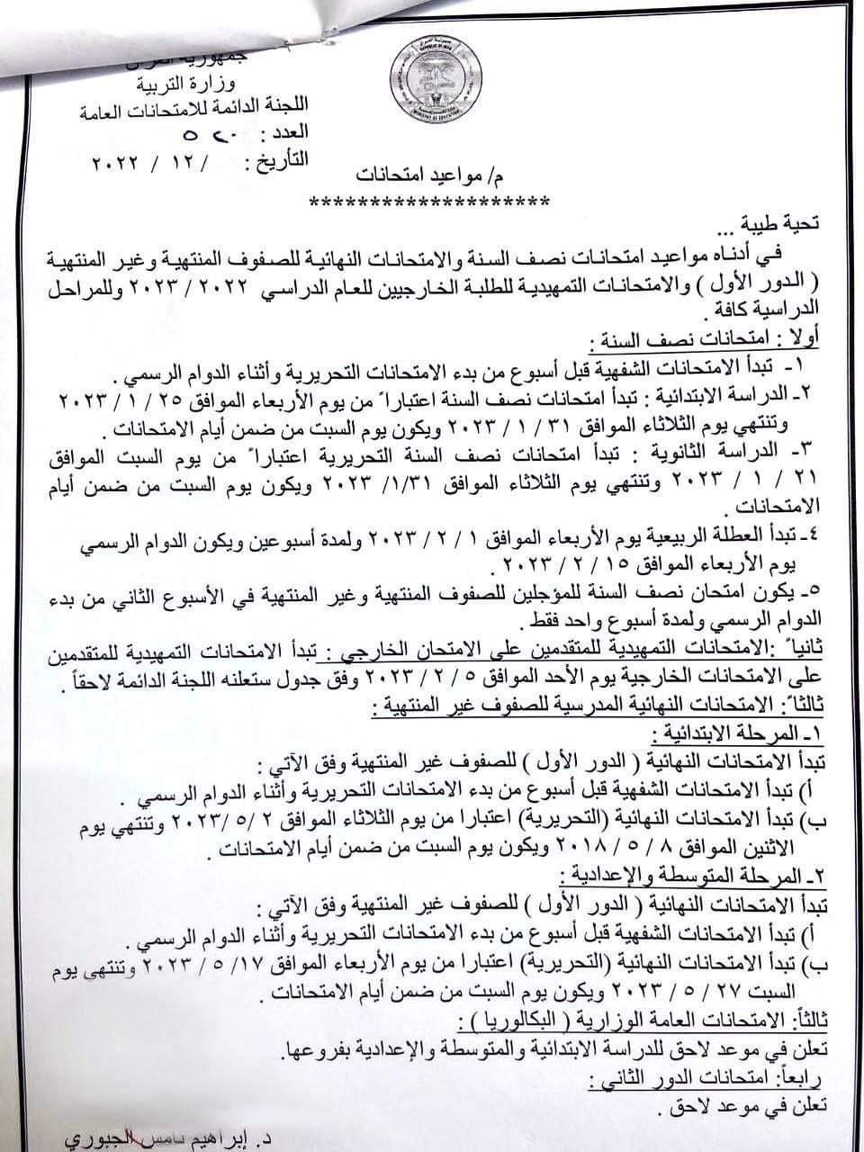 وزارة التربية تعلن مواعيد امتحانات نصف السنة والامتحانات النهائية