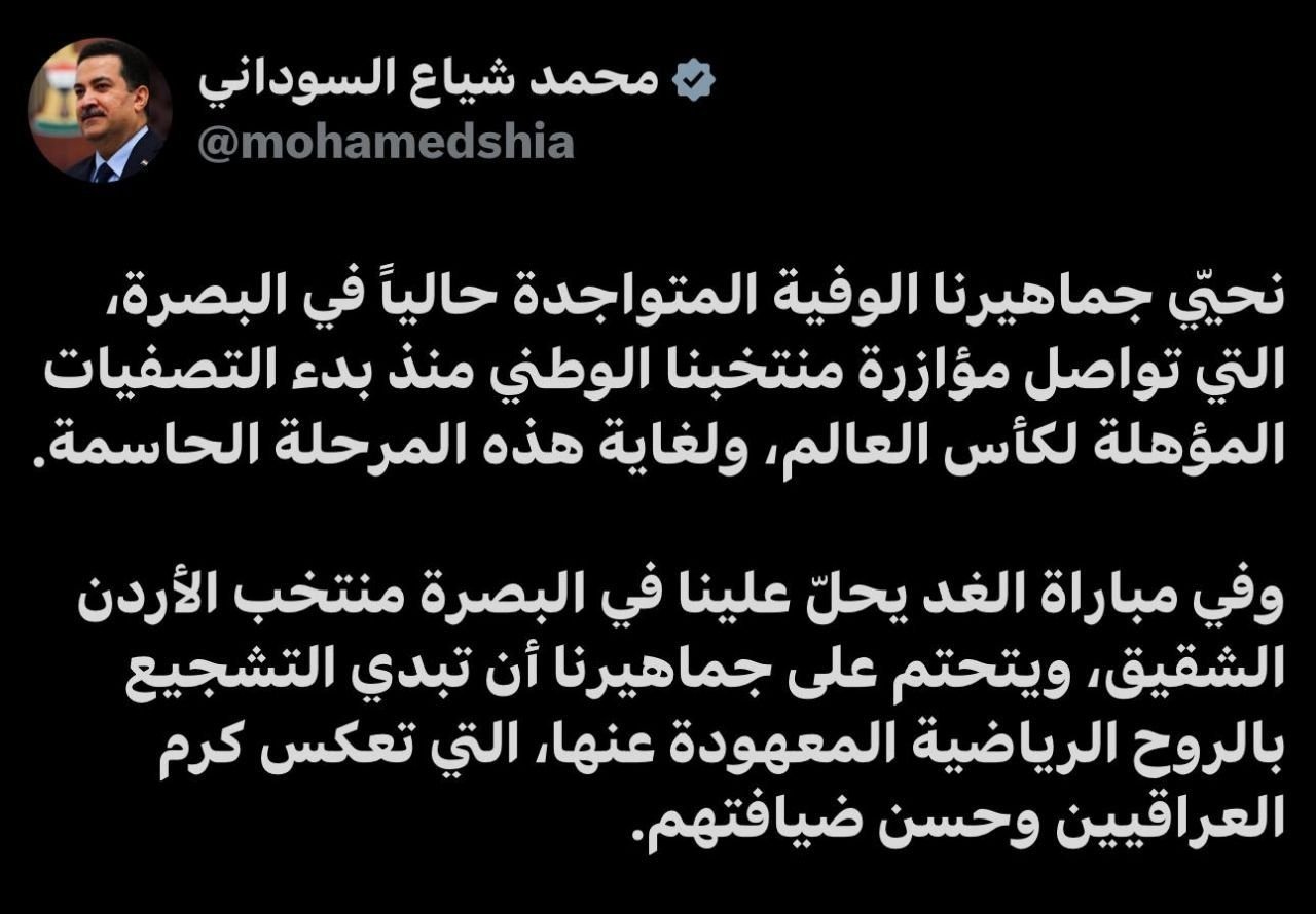 السوداني: مباراة العراق والأردن فرصة لتعزيز التواصل بين البلدين