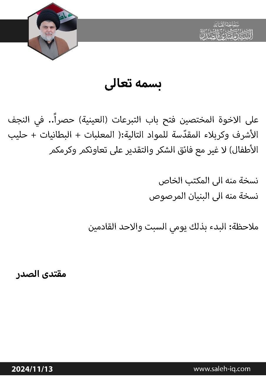 الصدر يوجّه مؤسسات التيار الإنسانية لجمع التبرعات العينية