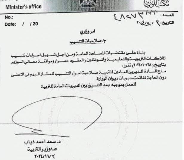 التربية تخول مديرياتها في المحافظات صلاحية اجراء التنسيب للعقود