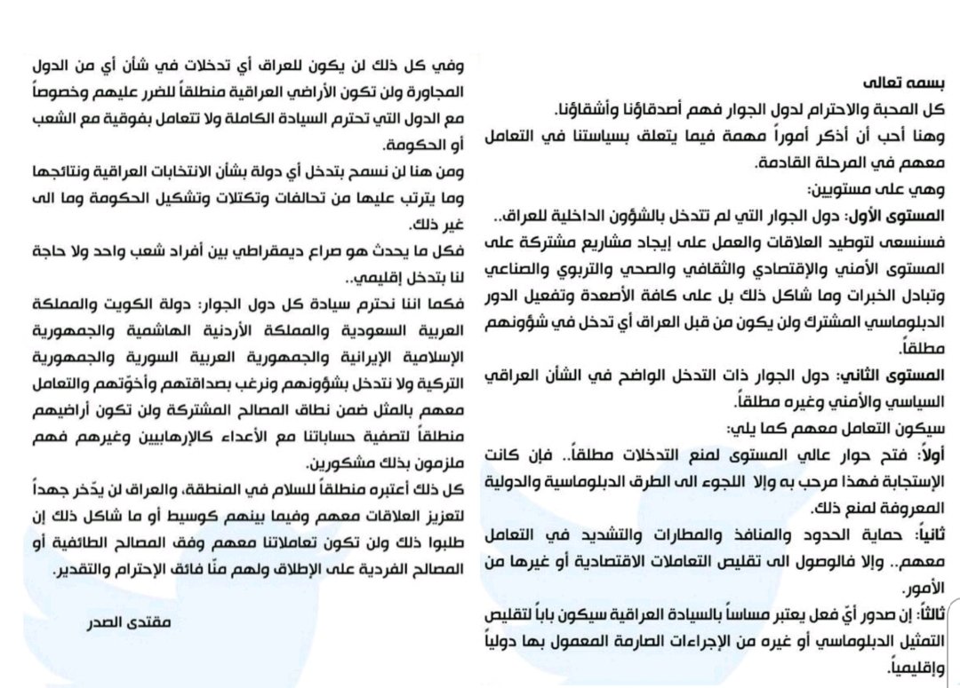 السيد الصدر يوجه رسالة لدول الجوار