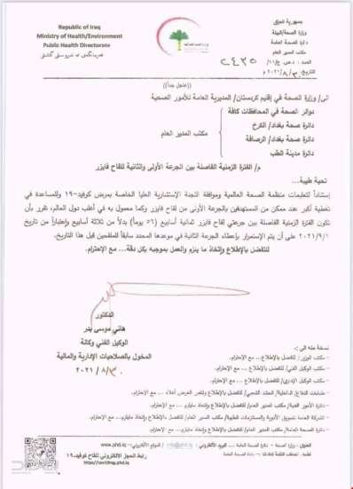 بالوثيقة.. الصحة العراقية تصدر توجيهاً يخص الجرعة الثانية بلقاح "فايزر"