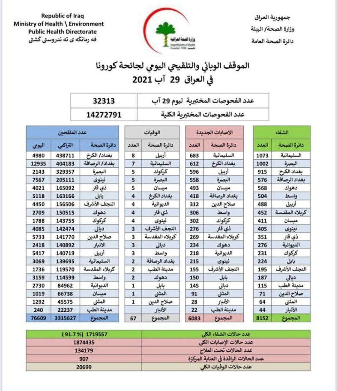 ارتفاع جديد.. العراق يسجل موقفا مثقلا بالإصابات والوفيات بكورونا
