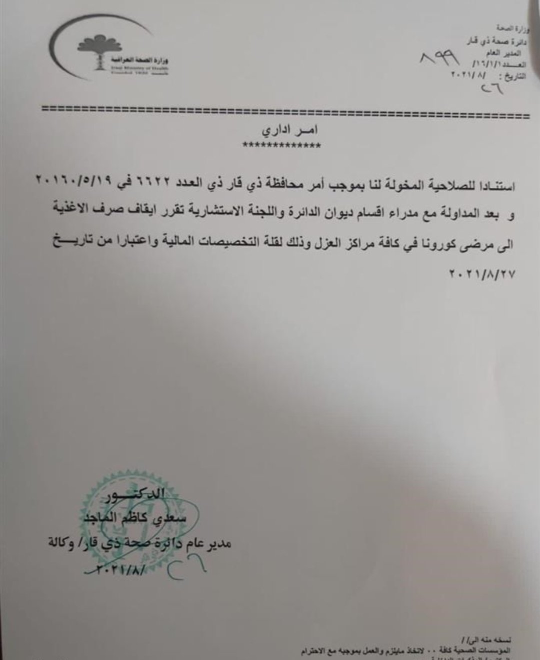 بالوثيقة.. صحة ذي قار توقف صرف الأغذية لمرضى كورونا