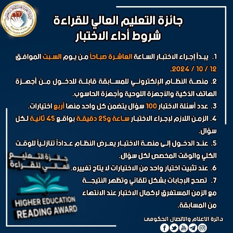 التعليم تعلن موعد وشروط اختبار جائزة التعليم العالي للقراءة