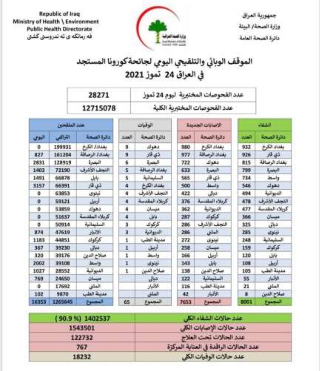 العراق يسجل انخفاضا بإصابات كورونا وارتفاع بمعدل الشفاء