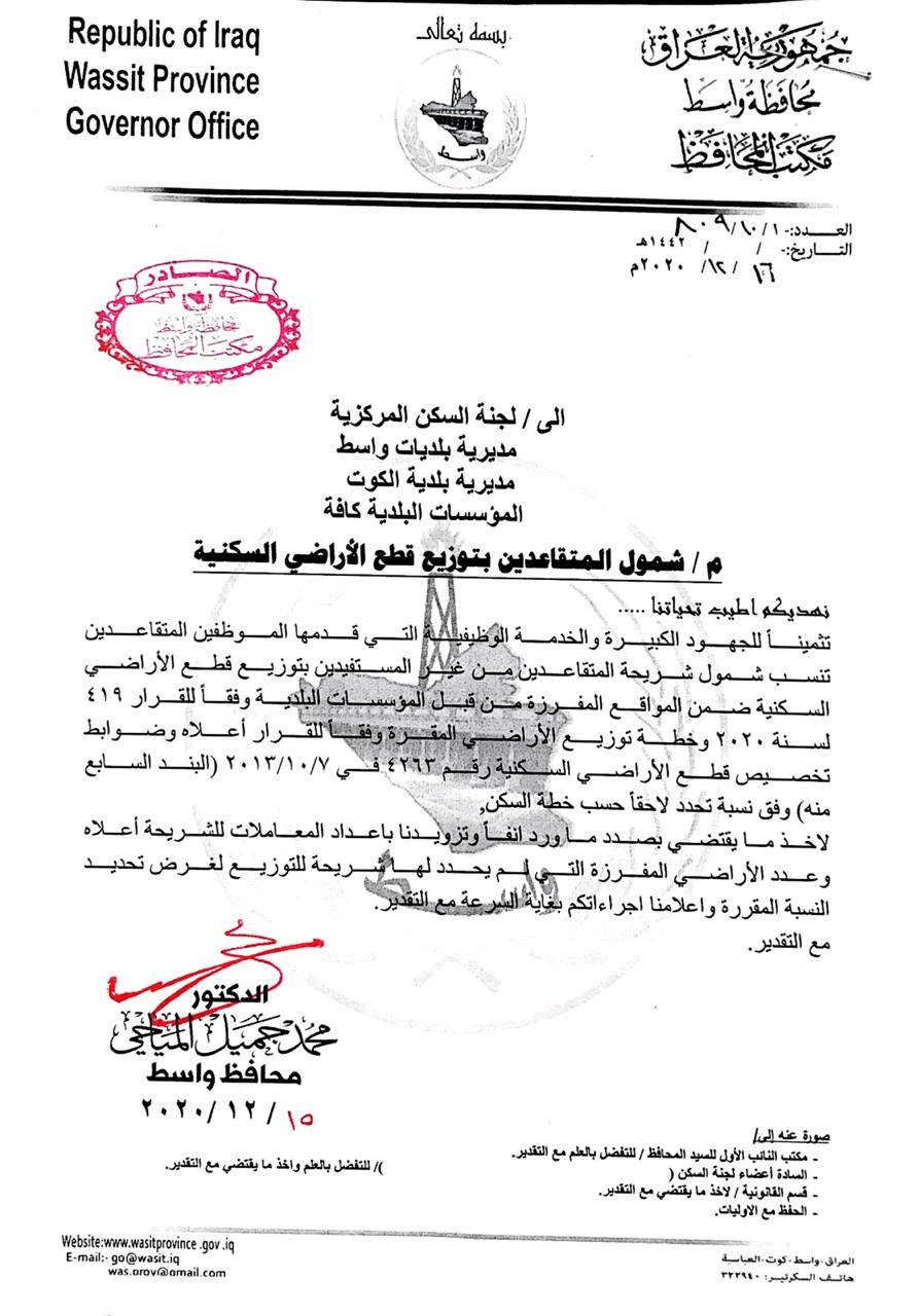 محافظ واسط يقرر توزيع قطع أراضٍ لهذه الشريحة