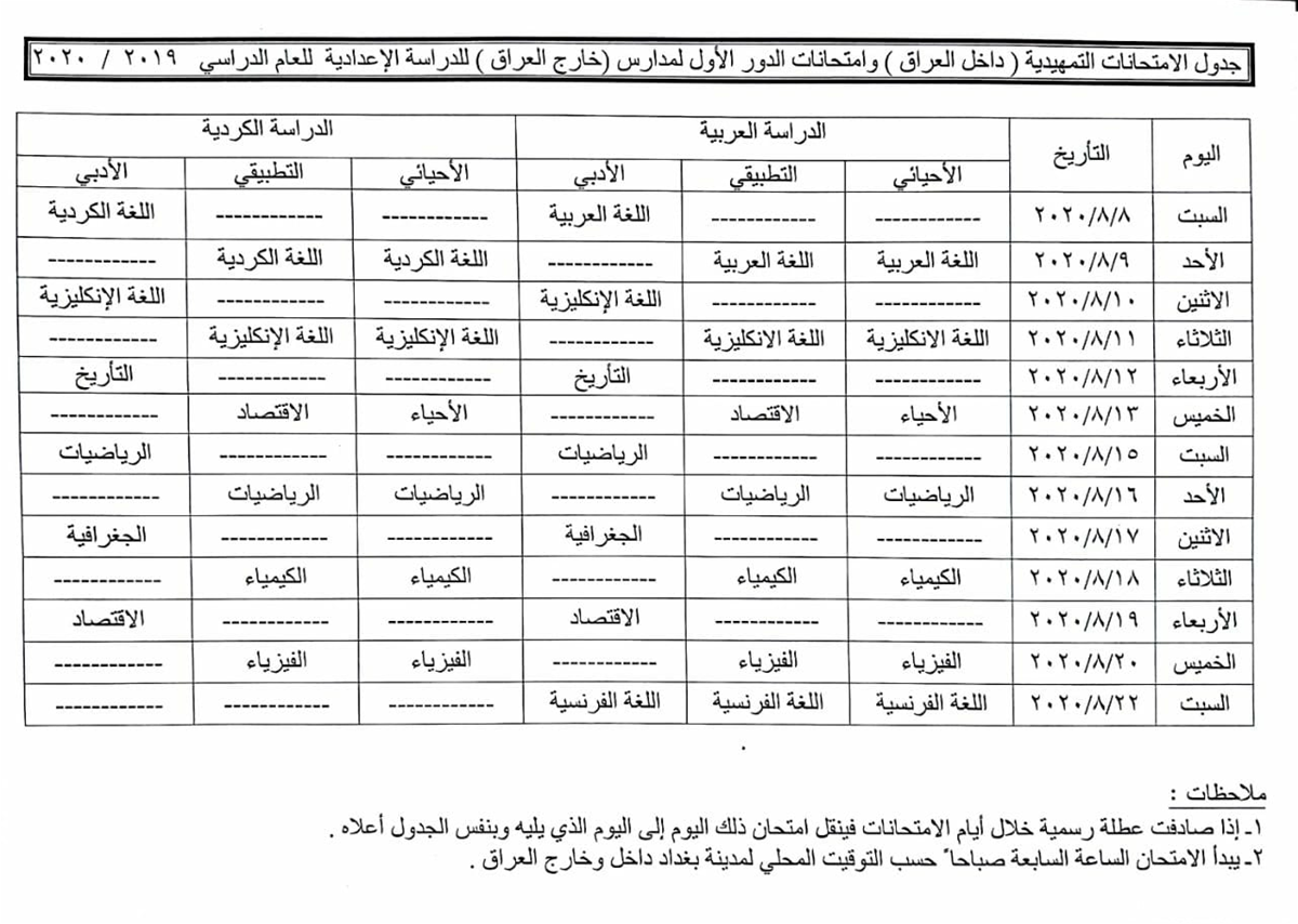 التربية تعلن عن الجدول الخاص بالامتحانات التمهيدية للطلبة الخارجيين للدراسة الاعدادية