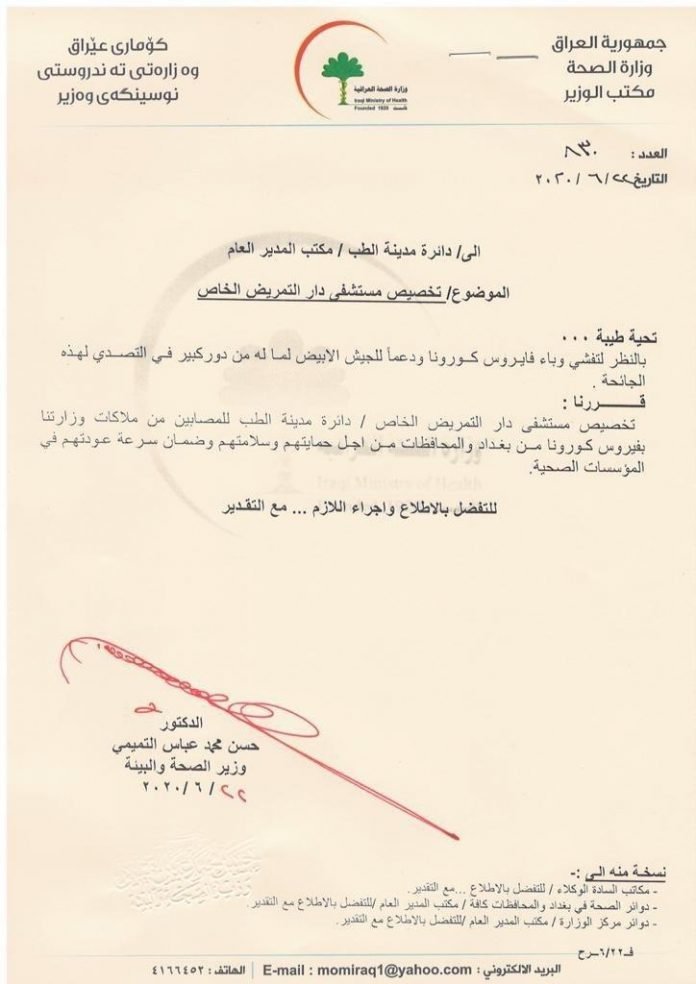 صحة النجف تعلن التوزيع الجغرافي لـ83 إصابة بفيروس كورونا