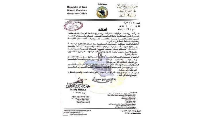 إعفاء مستأجري أملاك البلدية في واسط من الإيجارات وإيقاف استيفاء أجور الماء والكهرباء
