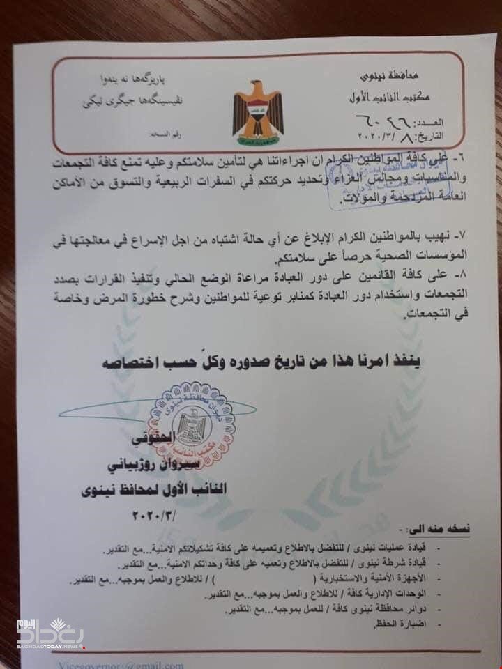بالوثائق.. خلية الأزمة في نينوى تصدر 8 توجيهات لتفادي ’’كورونا’’ بينها غلق منافذ دخول المحافظة