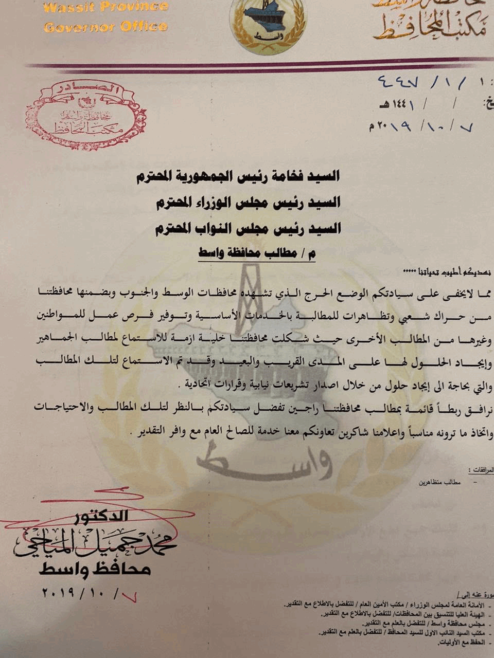 بالوثائق.. مطالب أهالي واسط المقدمة إلى الرئاسات الثلاث
