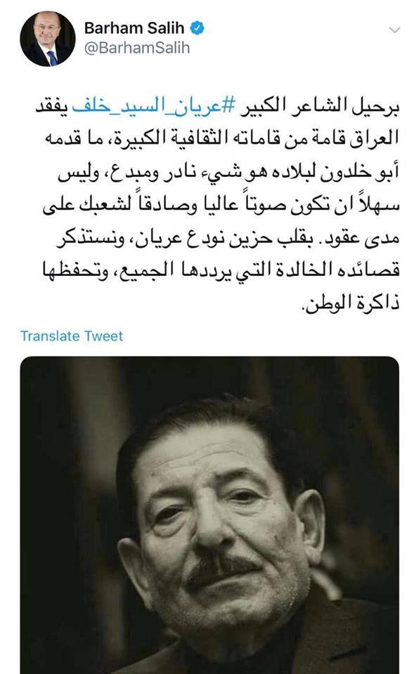 الاعلام الرقمي: تغريدة صالح في تعزية الشاعر عريان السيد خلف هي الاكثر تفاعلاً بالعراق