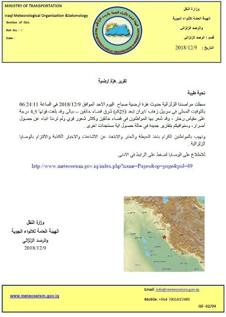 الانواء تنشر تقريرا عن الهزة الارضية التي ضربت خانقين فجر اليوم