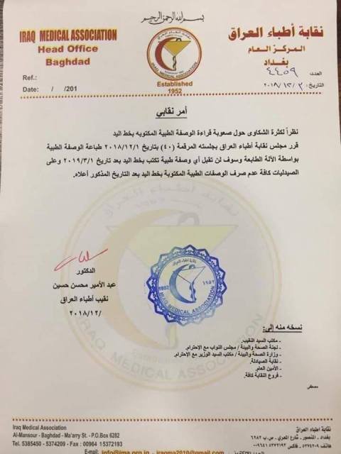 بالوثيقة.. إلزام الاطباء بطباعة الوصفة الطبية وتمنع الصيدليات من صرفها اذا كانت بخط اليد