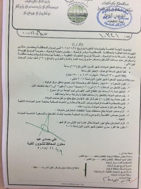 كركوك تحدد سعر أمبير المولدات الأهلية بـ8500 دينار