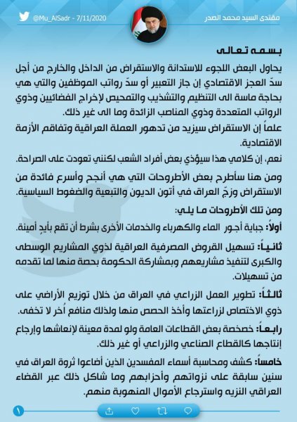 الصدر: العراق يخسر المليارات بسبب تواجد الاحتلال الأميركي ويجب إخراجهالمعلومة/بغداد..جدد زعيم التيار الصدري السيد مقتدى الصدر ، السبت، دعوته الى اخراج قوات الاحتلال الأميركي من العراق ، لافتا إلى أن العراق يخسر المليارات بسبب تواجد تلك القوات. :