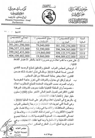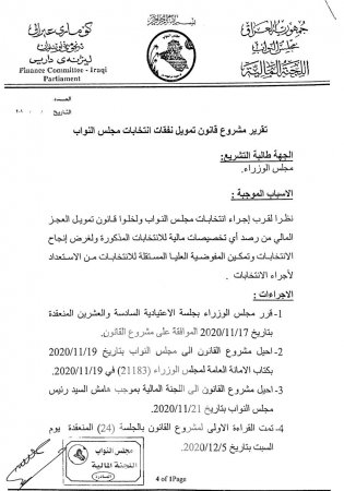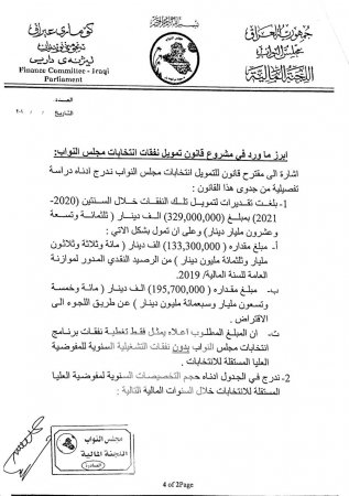 واقترحت اللجنة المالية النيابية، "الإبقاء على التخصيصات المقدرة لمفوضية الانتخابات ضمن قانون الموازنة المالية لسنة 2021 مالم تقدم السلطة التنفيذية مبررات وأسباب موجبة للقانون أعلاه"، فيما أوصت بـ"عرض مشروع قانون تمويل نفقات انتخابات مجلس النواب للقراءة الثانية في البرلمان بغية استكمال الاجراءات لتشريع القانون