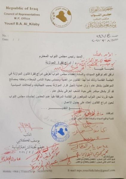 وقال مراسل وكالة من كربلاء الخبر ، ان “رئيس مجلس النواب محمد الحلبوسي وجه بإدراج مشروع قانون الموازنة يوم الاثنين المقبل، بناءً على طلب مقدم من النائب يوسف الكلابي موقع من 150 نائبا.