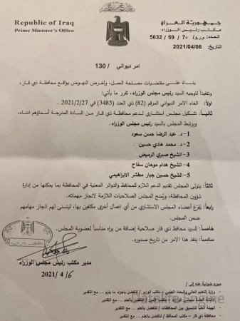 كما أصدر مدير مكتب رئيس الوزراء في وثيقة أخرى قراراً يتضمن "بناءً على مقتضيات مصلحة العمل، ولغرض النهوض بواقع محافظة ذي قار، وتنفيذاً لتوجيه رئيس مجلس الوزراء، تقرر ما يأتي: