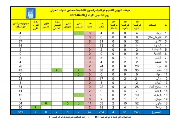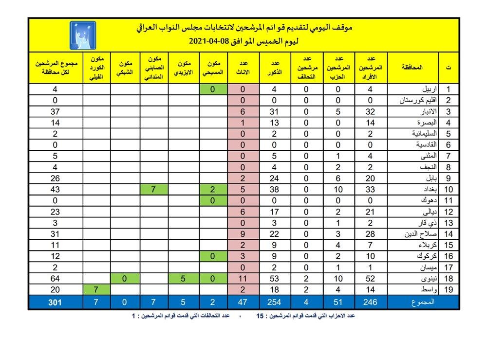 ويضيف الجدول أن "عدد المرشحين عن طريق التحالفات 4 اشخاص فقط وبهذا يصبح عدد المرشحين الكلي 301 مرشح في عموم العراق ".