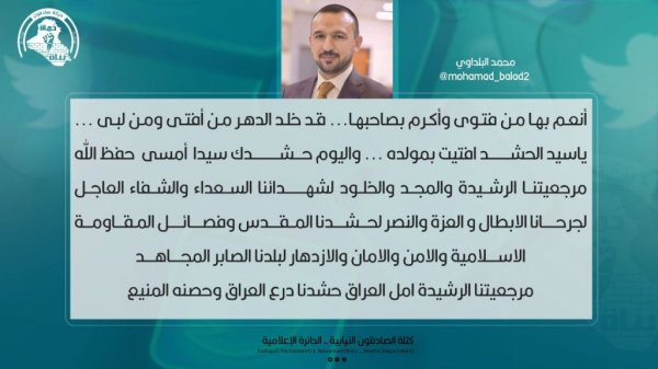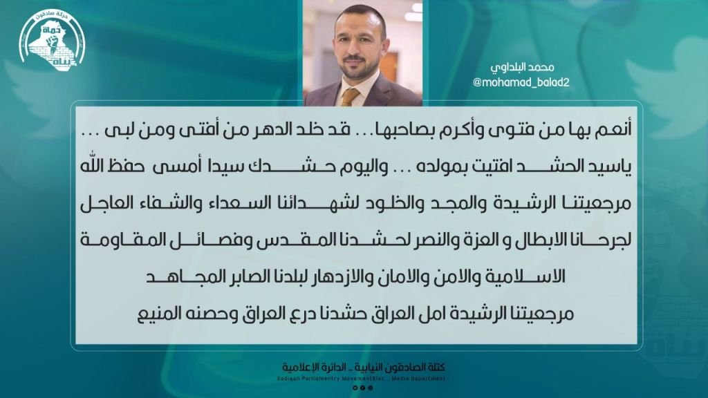 وقال البلداوي في تغريدة على تويتر تابعها صحفي ،“أنعم بها من فتوى وأكرم بصاحبها… قد خلد الدهر من أفتى ومن لبى… يا سيد الحشد افتيت بمولده… واليوم حشدك سيدا أمسى، حفظ الله مرجعيتنا الرشيدة والمجد والخلود لشهدائنا السعداء والشفاء العاجل لجرحانا الأبطال والعزة والنصر لحشدنا المقدس وفصائل المقاومة الإسلامية والأمن والأمان والازدهار لبلدنا الصابر المجاهد، مرجعيتنا الرشيدة أمل العراق حشدنا درع العراق وحصنه المنيع”.