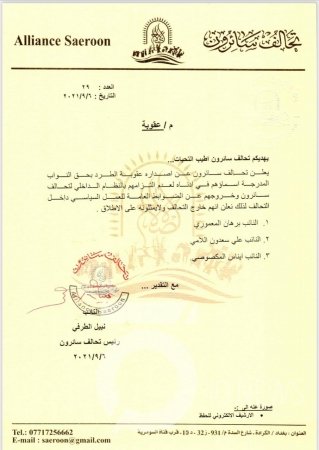 وأظهرت وثيقة تحمل توقيع رئيس تحالف سائرون، نبيل الطرفي، لصحفي، طرد أعضاء البرلمان عن التحالف، برهان المعموري وعلي سعدون اللامي، وإيناس المكصوصي.