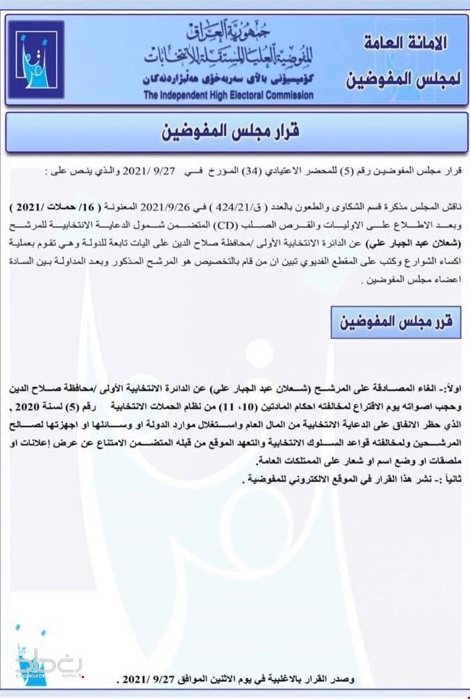 وذكرت المفوضية في بيان لصحفي، أنه "تقرر الغاء المصادقة على المرشح (شعلان عبد الجبار علي) عن الدائرة الانتخابية الأولى في محافظة صلاح الدين وحجب أصواته يوم الاقتراع".