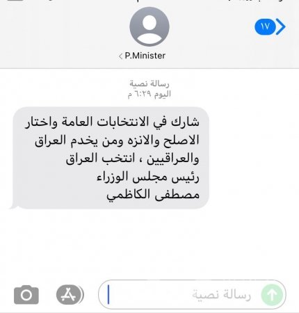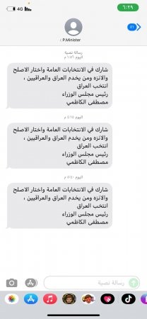 وصلت إلى هواتف العديد من العراقيين، السبت (9 تشرين الأول 2021)، رسالة مذيلة باسم رئيس مجلس الوزراء مصطفى الكاظمي، وتدعو إلى "انتخاب الأصلاح والأنزه" في الاقتراع العام الذي سيجري يوم غد ضمن الانتخابات البرلمانية.