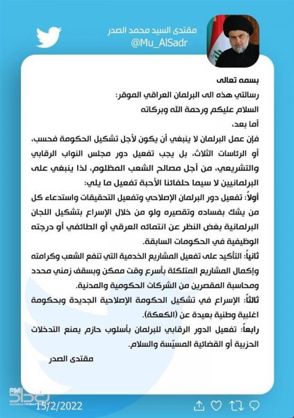 وجه زعيم التيار الصدري مقتدى الصدر، اليوم الثلاثاء، رسالة للبرلمان يطالب بها بأربعة امور.