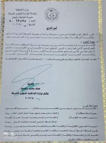 الداخلية تشكل لجاناً لتدوير المدراء والآمرين الذين مضى على تنصيبهم 4 سنوات (وثيقة)
