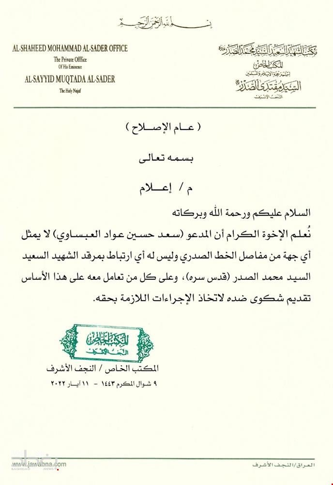 اعلن المكتب الخاص لزعيم التيار الصدري مقتدى الصدر، ان المدعو (سـعـد حسـين عـواد العبساوي) لا يمثل أي جهة من مفاصل الخط الصدري. وأضاف، في وثيقة انه "ليس له ارتباط مرقد الشهيد السعيد السيد محمد الصدر (قدس سره)".