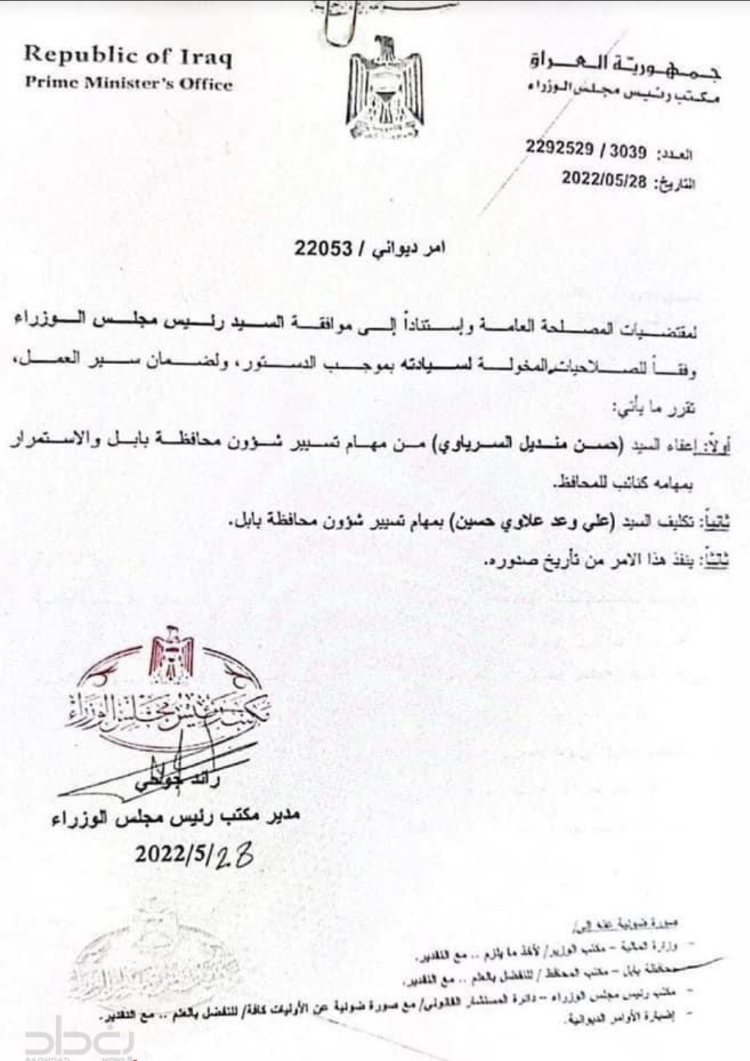 أعفى رئيس الوزراء مصطفى الكاظمي، اليوم السبت، محافظ بابل وكالة حسن منديل من منصبه.