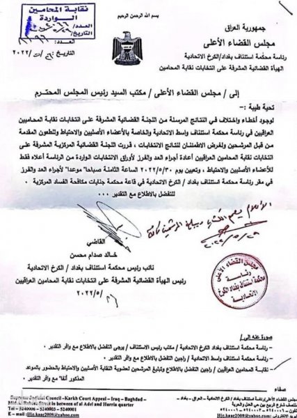 واظهرت وثيقة حصل عليها صحفي إن "اللجنة القضائية المركزية المشرفة على انتخابات نقابة المحامين العراقيين تقرر إعادة إجراء العد والفرز لأوراق الانتخابات الواردة من محكمة استئناف واسط الاتحادية، لوجود أخطاء واختلاف في النتائج المرسلة من اللجنة القضائية المشرفة في المحكمة المذكورة والخاصة بالأعضاء الأصليين والاحتياط ".