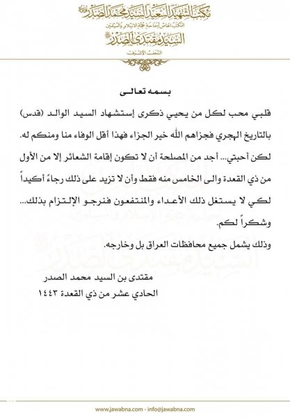 أصدر زعيم التيار الصدري السيد مقتدى الصدر، اليوم السبت، بياناً بخصوص إحياء ذكرى استشهاد السيد محمد الصدر ونجليه (قدست أسرارهم)، داعياً فيه الى أن لا تزيد أحياء ذكرى الاستشهاد عن خمسة أيام، مؤكداً على أهمية الالتزام سواء داخل العراق أو خارجه.
