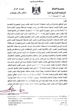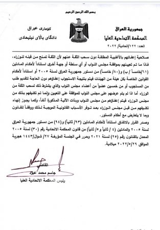 وقالت المحكمة في بيان إنها "اصدرت قرارها التفسيري بالعدد (122/ اتحادية / 2022) المتضمن تحديد آلية استجواب مسؤولي الهيئات المستقلة وفقاً لأحكام الدستور".