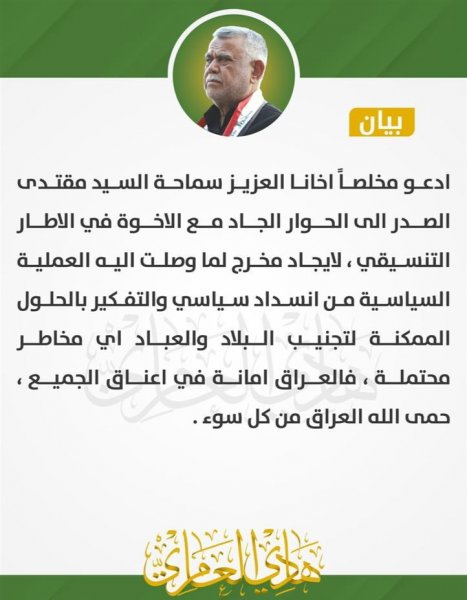 دعا رئيس تحالف الفتح، هادي العامري، اليوم السبت، زعيم التيار الصدري، مقتدى الصدر، إلى الحوار الجاد مع الإطار التنسيقي.ادناه نص بيان العامري: