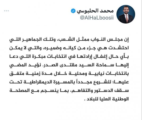 وقال الحلبوسي في تغريدة له تابعتها وكالة من كربلاءالخبر: إن "مجلس النواب ممثل الشعب ،وتلك الجماهير التي احتشدت هي جزء من كيانه وضميره، والتي لا يمكن بأي حال إغفال إرادتها في انتخابات مبكرة التي دعا السيد السيد مقتدى الصدر".