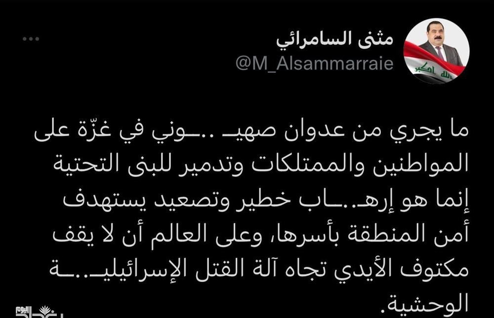 وقال السامرائي في "تغريدة" له "بتويتر"، تابعتها وكالة من كربلاء الخبر ان "مايجري من عدوان صهيوني في غزة على المواطنين والممتلكات وتدمير البنى التحتية هو إرهاب خطير وتصعيد يستهدف امن المنطقة باسرها".